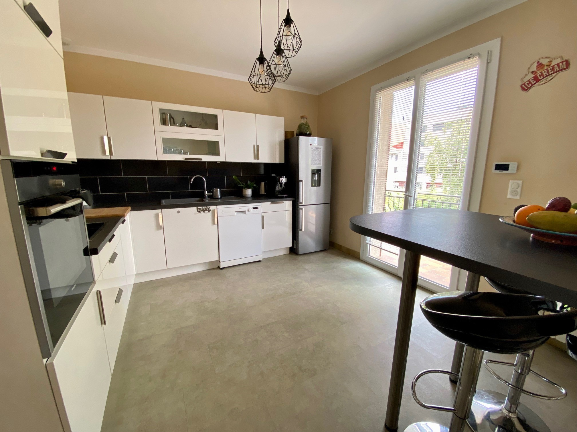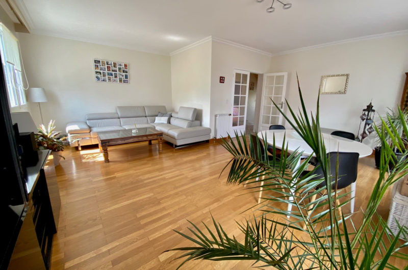 Le premier étage se compose d’un double séjour et d’une cuisine équipée (sauf réfrigérateur) donnant sur un balcon, de deux chambres ainsi que d’une salle d’eau.